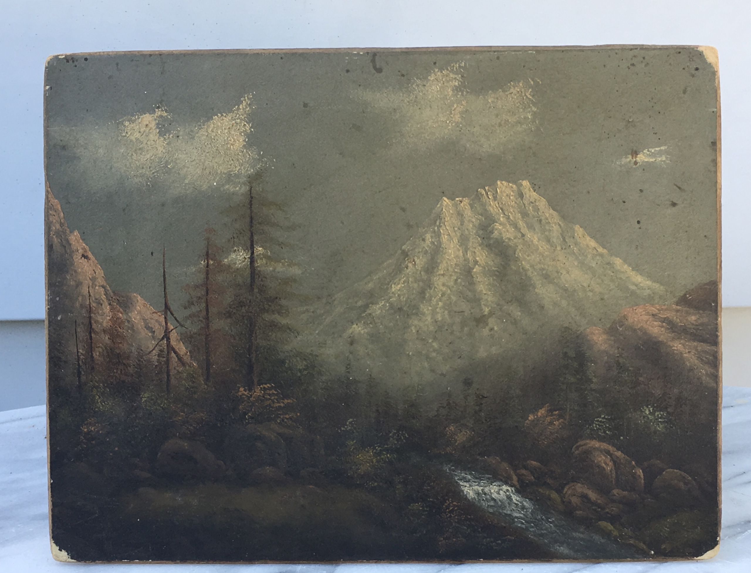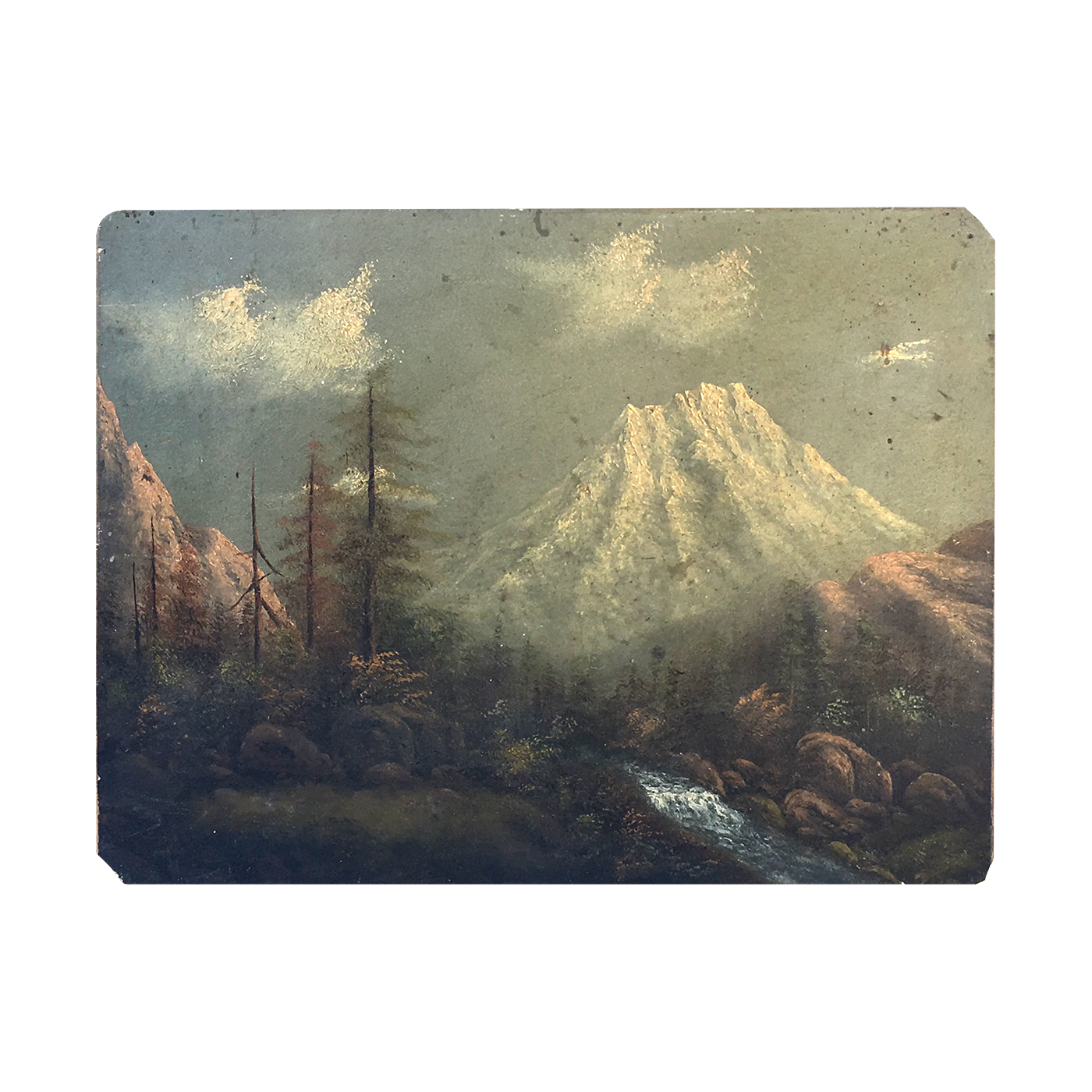[unattributed] American Mount Shasta, ca.1880 Oil on board 6-1/2 x 8-1/2 inches Signed on back : ‘Miss Minerva Swank’.