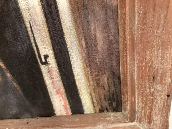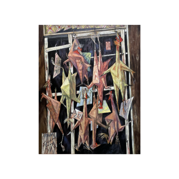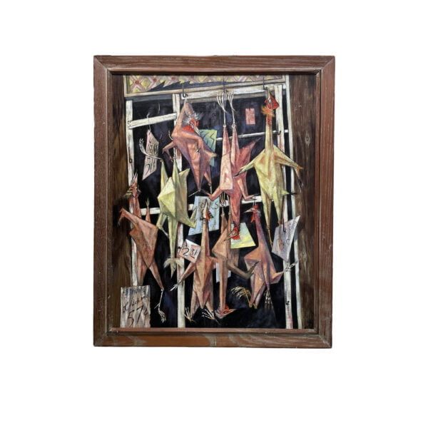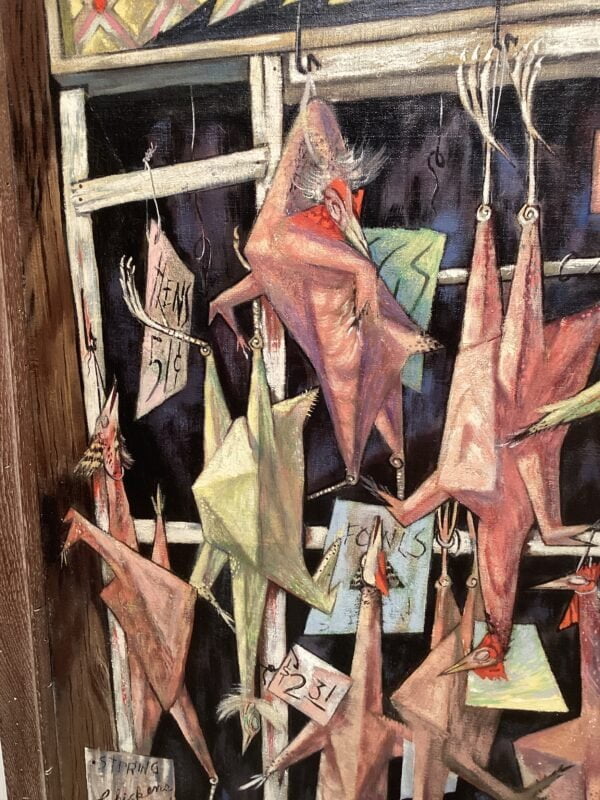 Similar in flavor to the works of Wilfredo Lam (1902-1982), Clifford Edgar Jones (1915-1975) work reflects the early abstract movement in America. The works are figurative but geometricized and increasingly abstract and fractal. Picking up aspects of the Cubist movement and combining it with the colors and compositions of WPA murals and adding in an undertone of Social Realist aesthetic and tone. All of these influences can be clearly seen in Chickens for sale the painting be offered.