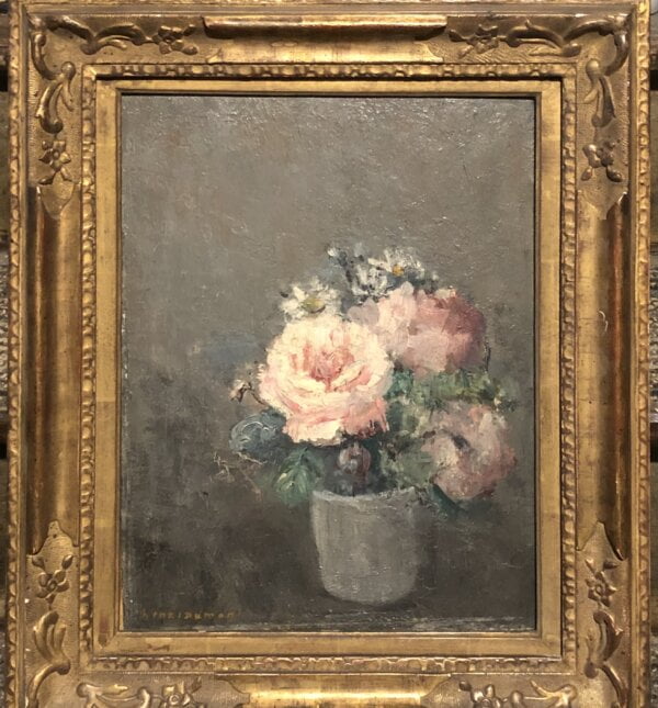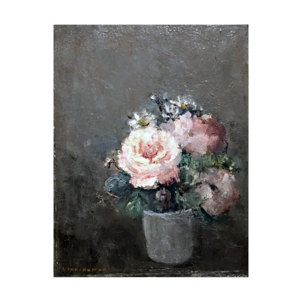 In 1883, Dumont set up a painting studio at 11 Boulevard de Clichy and became a member of the Societe National des Beaux-art. By 1884, he is listed as a flower painter, but does not begin almost exclusively painting flowers until 1897-1900. Dumont signs his flower paintings “Henri Dumont” rather than his full given name.