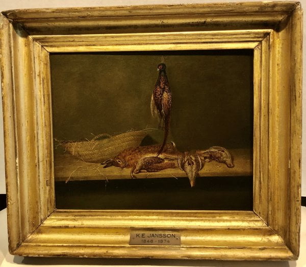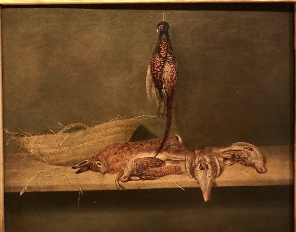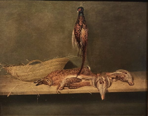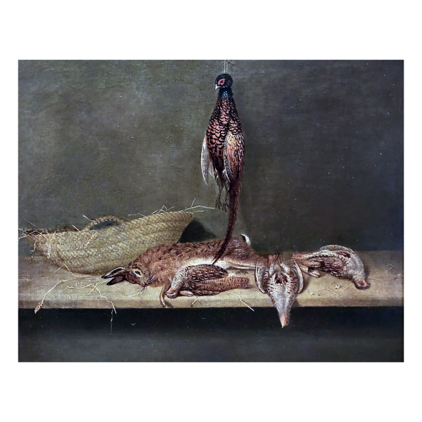 Still-life with pheasants, hare and woven basket, 1864.
