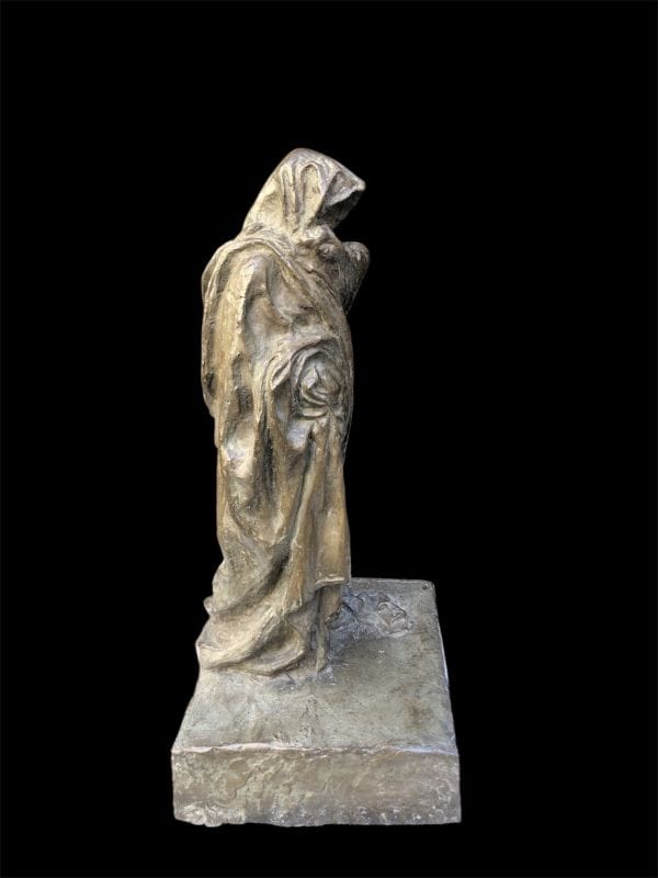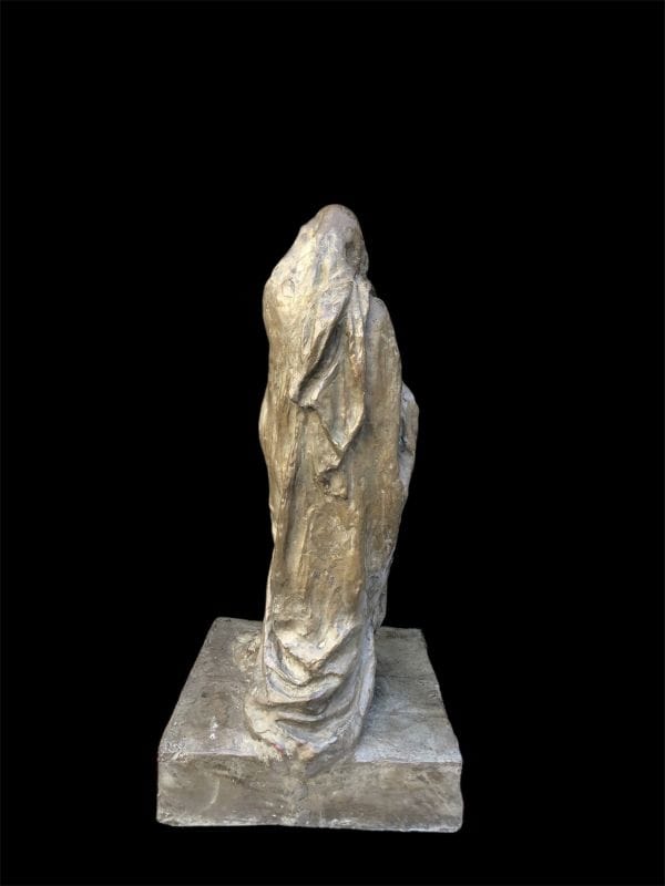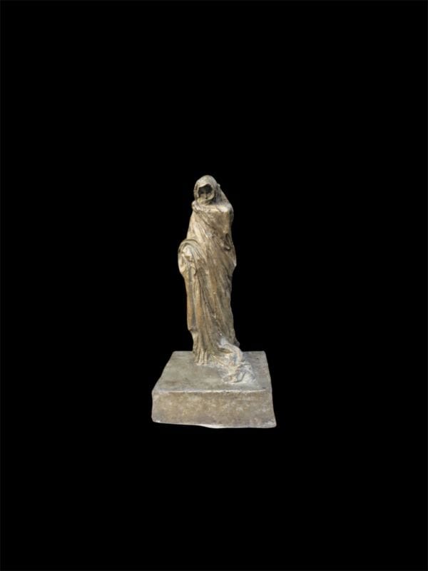 Donna con mantello [woman in cloak] is a theme from classic Greek sculpture that again found favor at the turn-of-the-century. The final blossoming of Symbolism and Mysticism lead authors and artists to portray woman as mysterious and even downright malevolent and ominous. As the son of a wood sculptor, Leonardo Bistolfi [1859-1933] was a talented all-round artist. He painted, sculpted and drew exceptionally well even from a young age. Bistolfi’s Donna con mantello [woman in cloak], ca.1912 is similar to other sculpture works by the artist. It is a theme he would often take up.