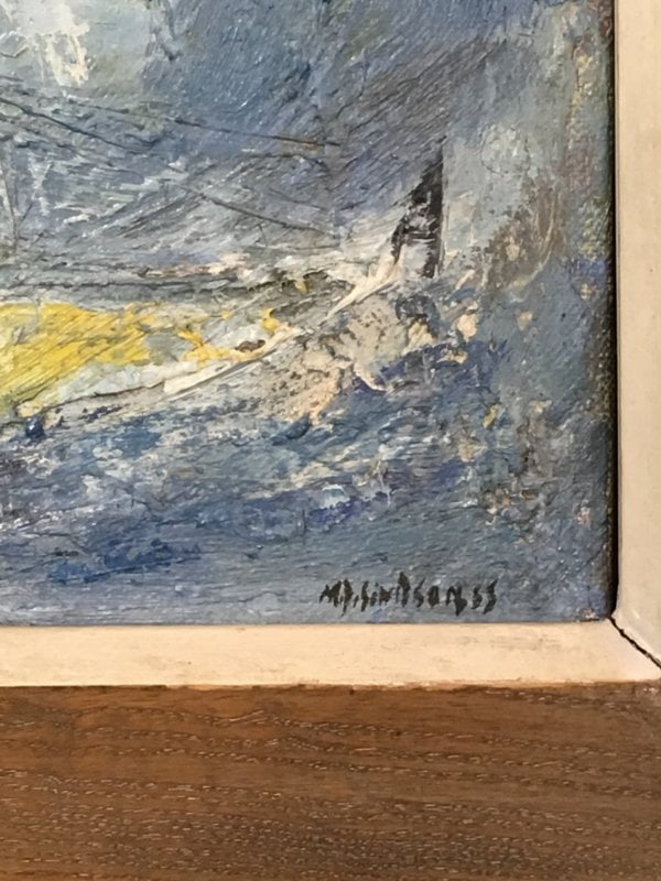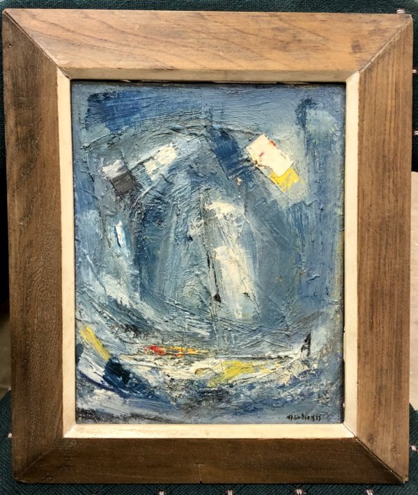 Signed at lower right : ‘M.D. SIMPSON 55’. Titled on canvas stretcher verso : ‘Poem of the sea’.