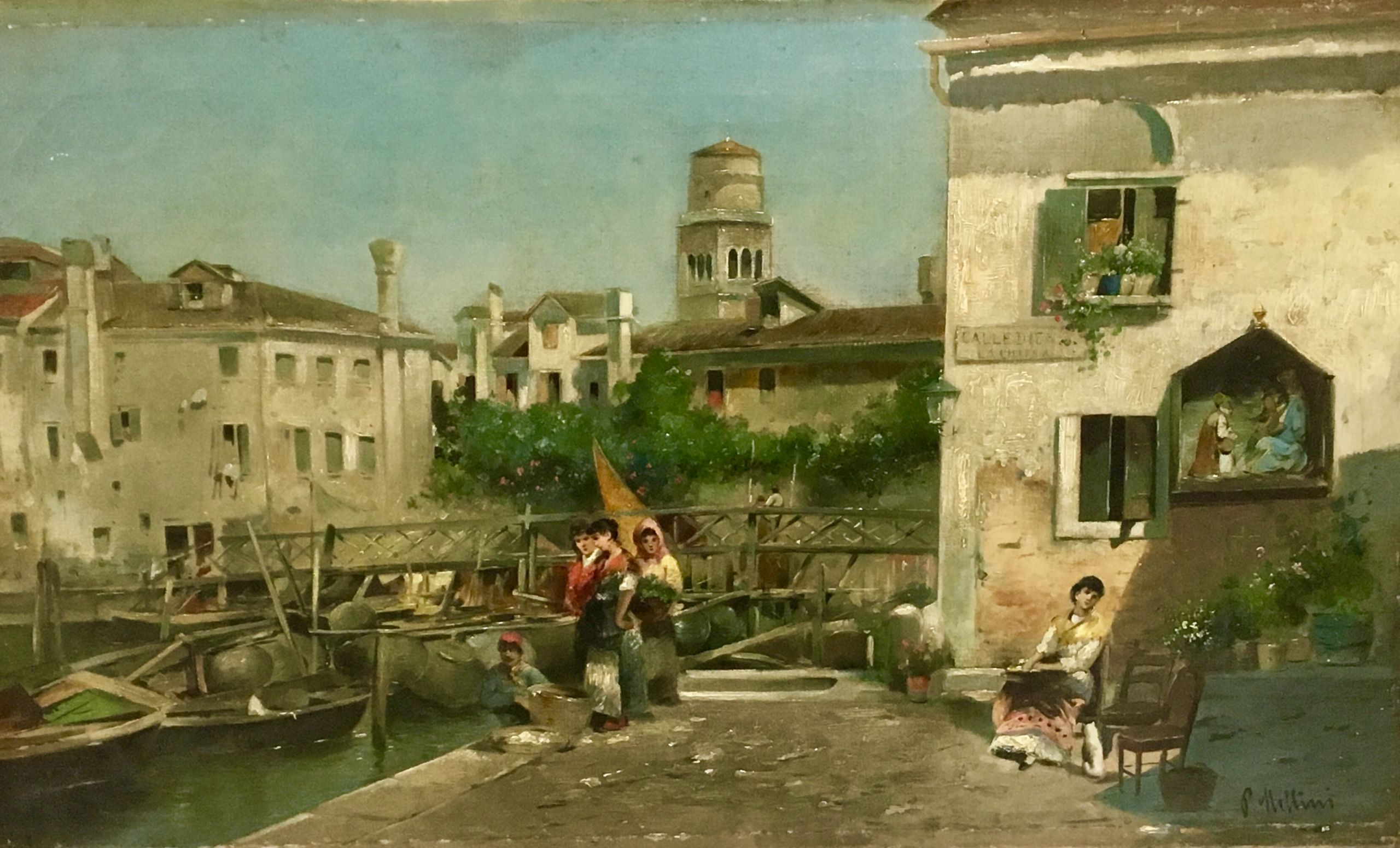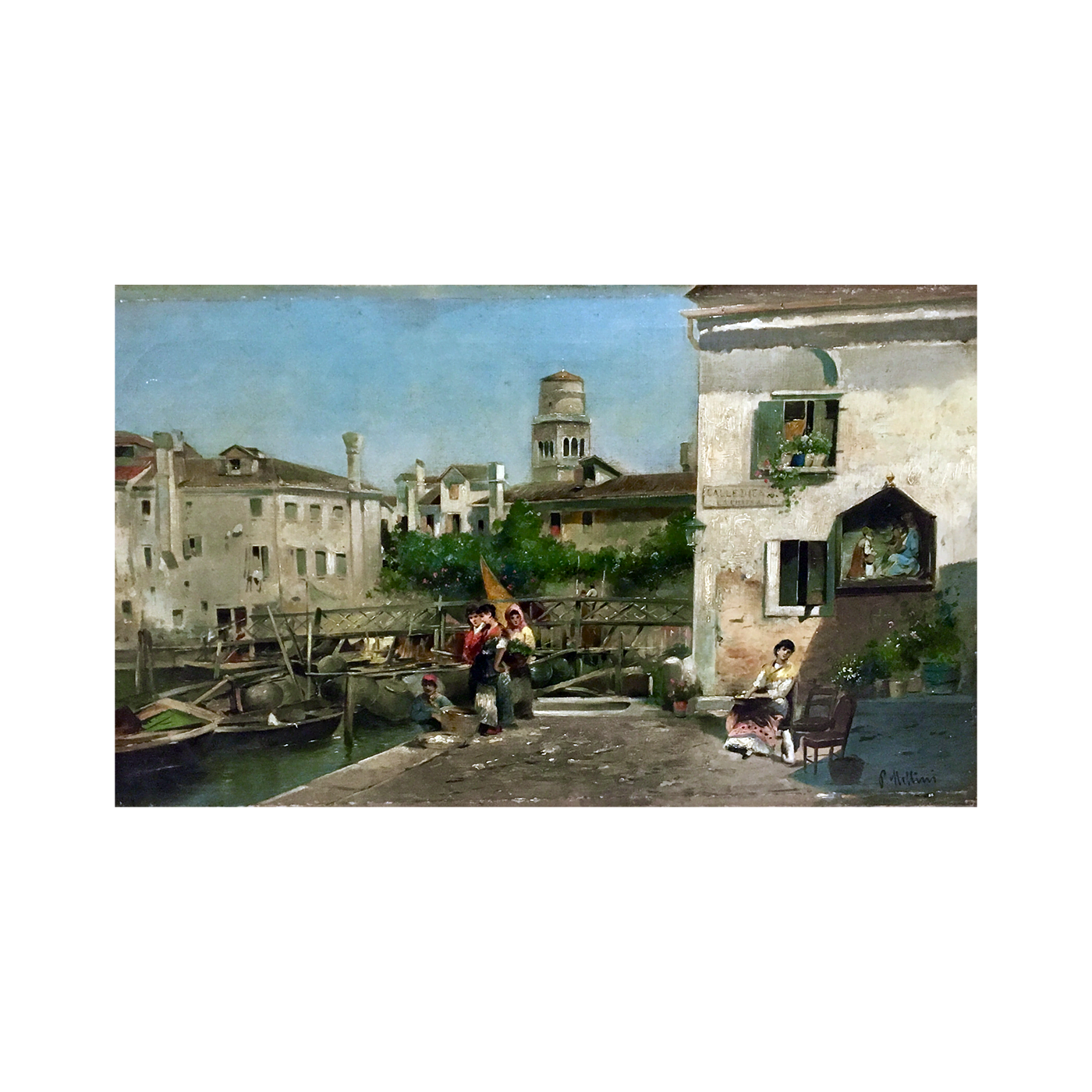 P.Mellini Italian Pisa? canal, ca.1880 Oil on canvas 12 1/2 x 21 inches Signed at lower right :