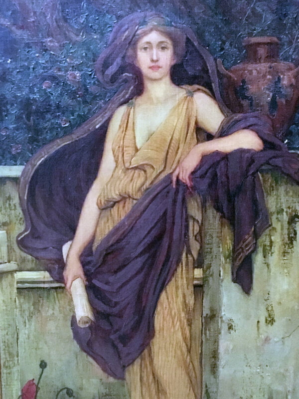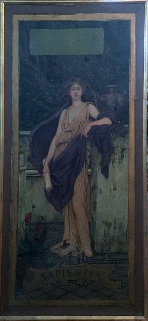A student of Gustave Clarence Rodolphe Boulanger [1824-1888] and Jules Joseph Lefebvre [1836-1911] in Paris, Sewell’s work most mirrors his master Lefebvre. Sapientia, ca.1895, which means wisdom is either meant to be an ad or more likely a study for an architectural mural. The painting is a lone woman in classical contrapposto holding a book and scrolls, the elements of wisdom. The work is reminiscent of Lefebvre’s Young Symbolist Woman. The painting is large at 43 inches tall and has not had any restoration. Colors would be luminous with a cleaning.