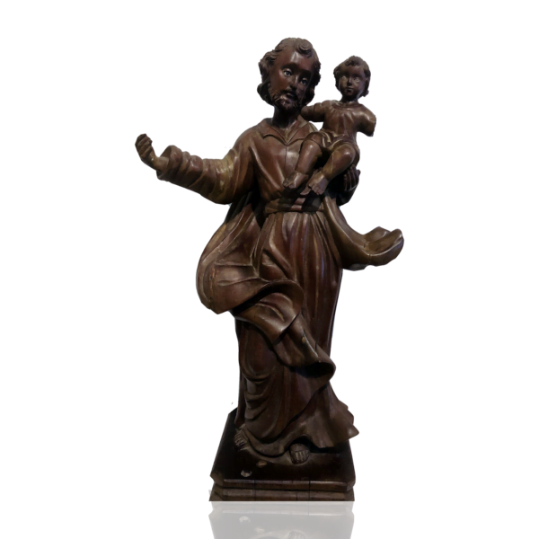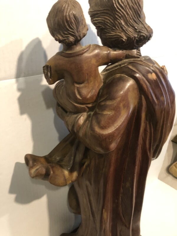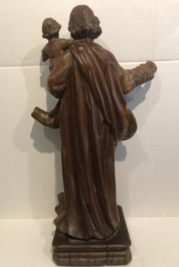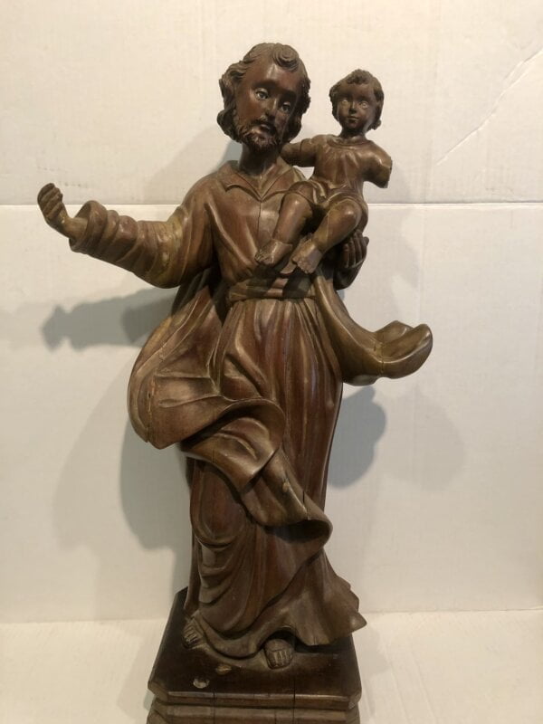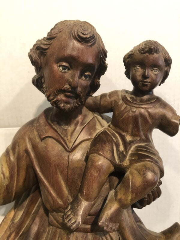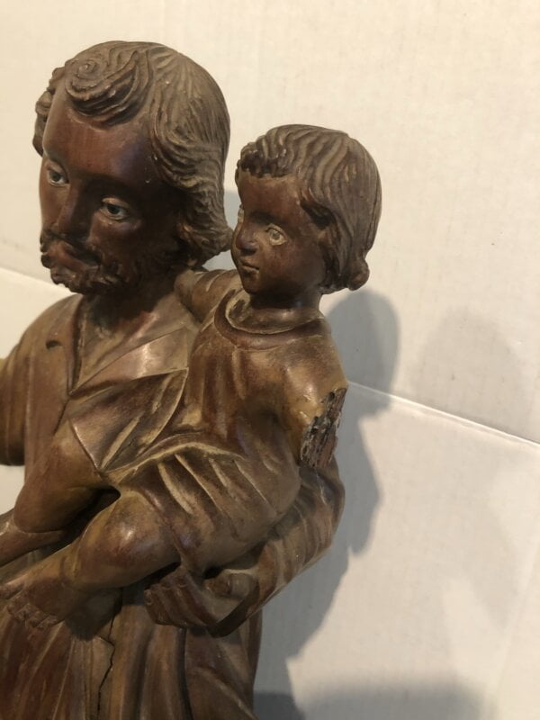 Small child carried by the figure is missing arm. The saint is missing thumb and fingers which are glued. Please review all photos for condition. Age appropriate separation. Original Glass Eyes