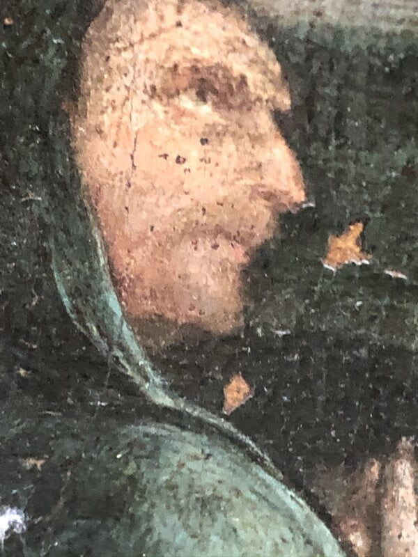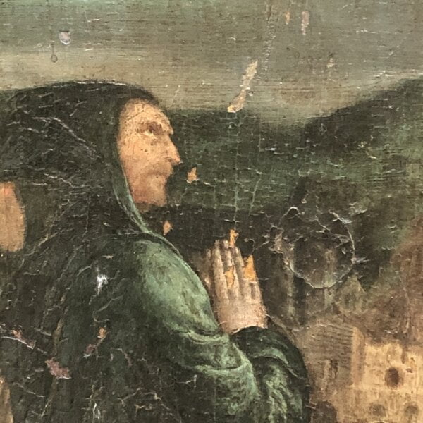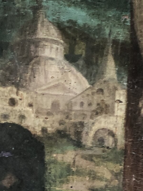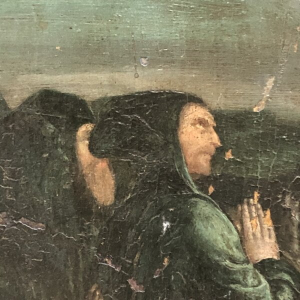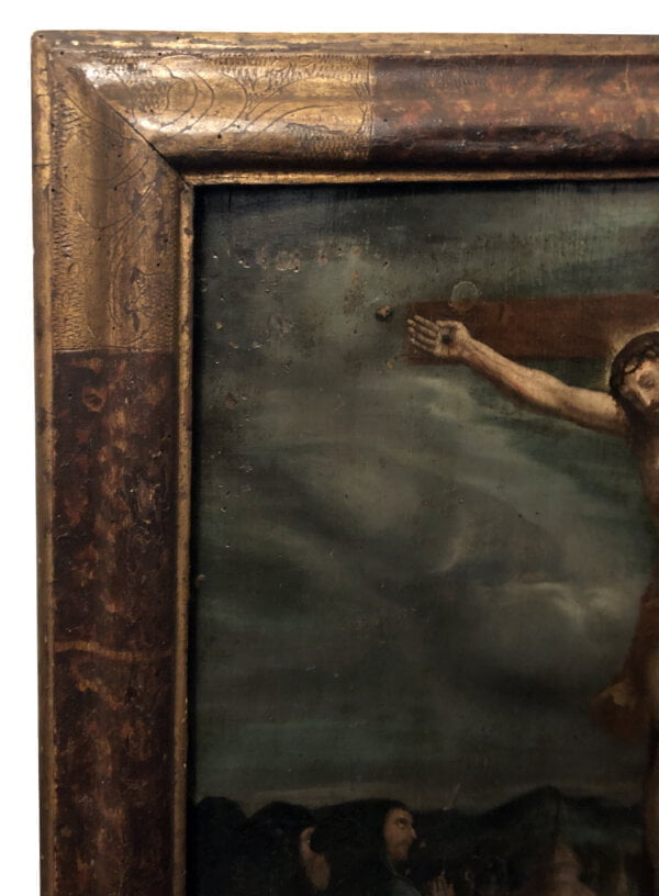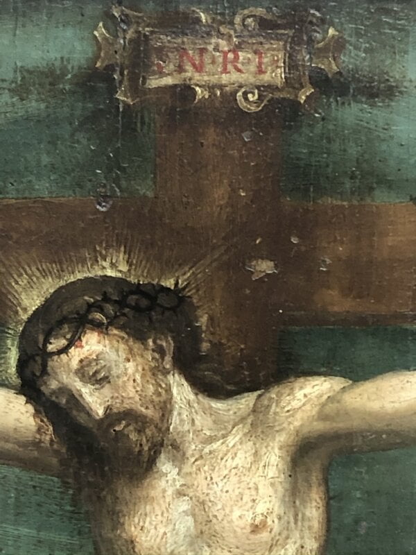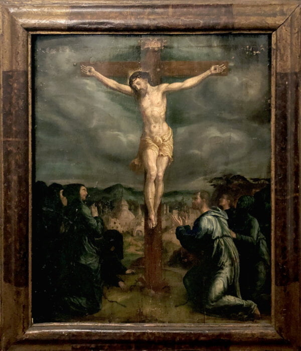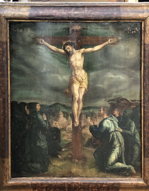 The Crucifixion, ca.1615 is a Roman catholic depiction of Jesus on the cross. Benedictine monks in black robes and hoods kneel to the left. The Benedictine monks swear a life of poverty and devote themselves to Jesus. On the right, Saint Joseph of the Franciscan friars in grey takes a knee with Mary to his right. There were likely pigments that were glazed over the Mary figure in blue, but the colors faded and became fugue. In the background are large Byzantine churches.
